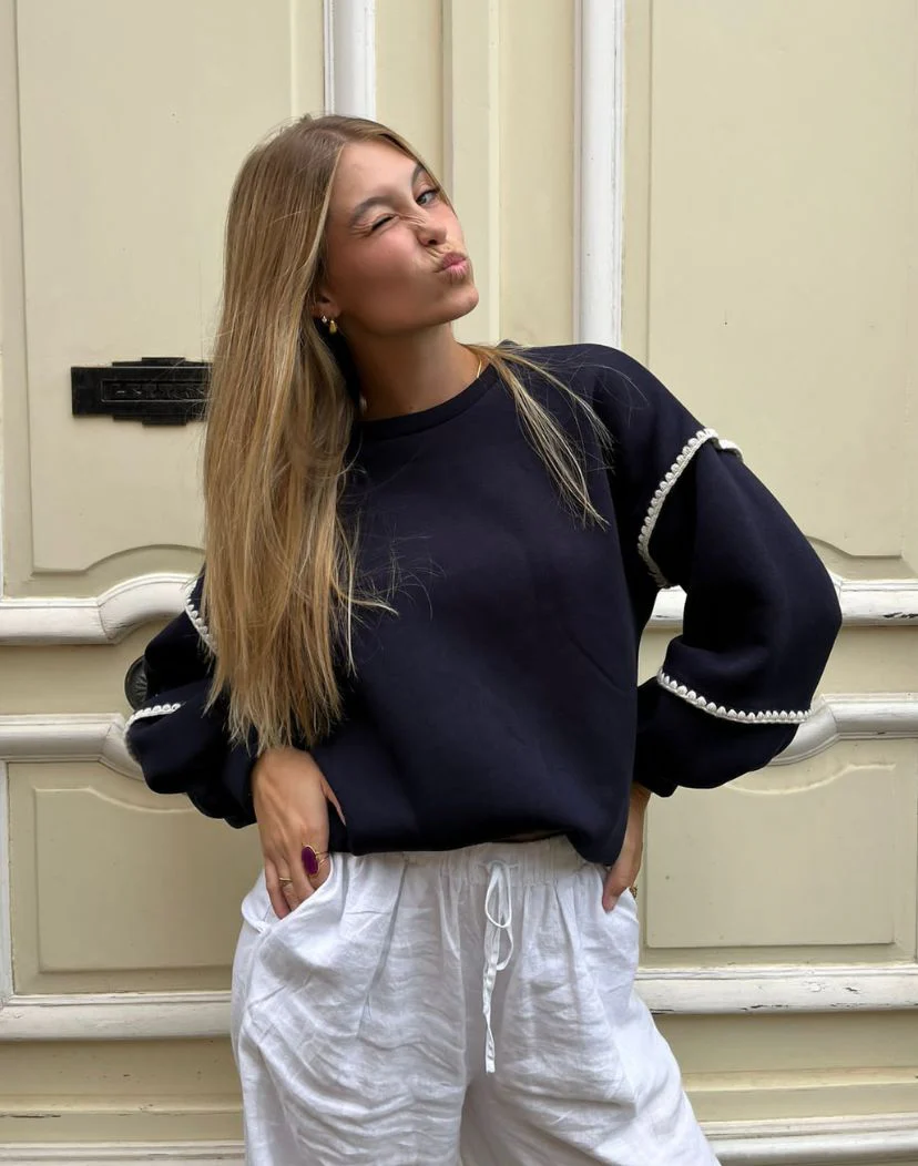 De Julie Borduur Sweater is een unieke variant van de klassieke Julie sweater, met subtiele borduursels langs de mouwen die zorgen voor een speelse en stijlvolle touch. De oversized pasvorm en wijde mouwen maken dit item extra comfortabel en trendy. Perfect te combineren met jeans of een rok voor een effortless look.
